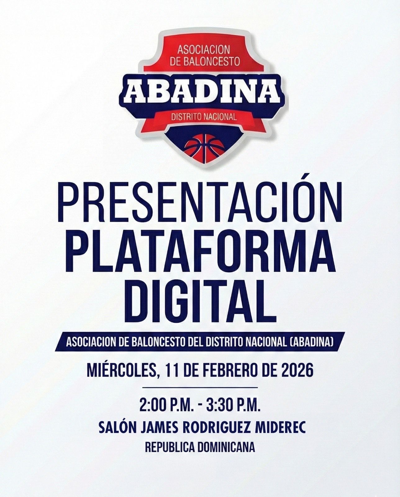 SANTO DOMINGO, RD.- La Asociación de Baloncesto del Distrito Nacional (Abadina) presentó este miércoles su innovadora plataforma digital en beneficio de los más de 30 clubes que la conforman, jugadores, entrenadores, técnicos y dirigentes deportivos.